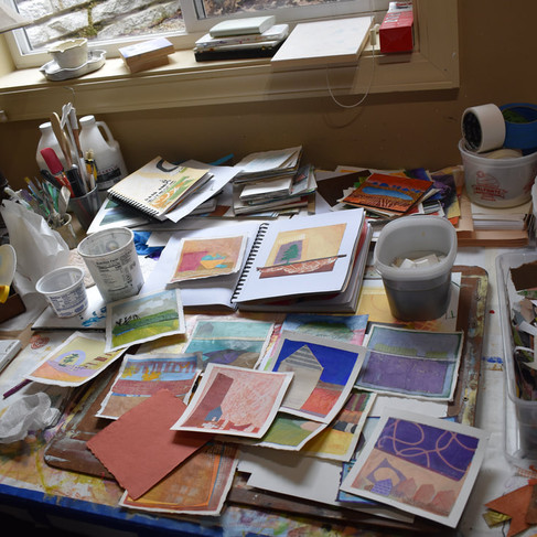 When we visited Nokes's studio recently, she had a piece on her easel that was in progress. She started out wanting to highlight the blue and yellow of the Ukraine flag, but once the piece featured a sunflower, it became a Kansas painting as well. Nokes had loosely attached yellow paper cut into the shape of petals. While speaking about her studio, her eyes kept falling on the piece in progress, and she interspersed her discussion about her workplace with a discussion with herself about where the sunflower piece was going to go next in its development. This presented a chance to learn more about her process.